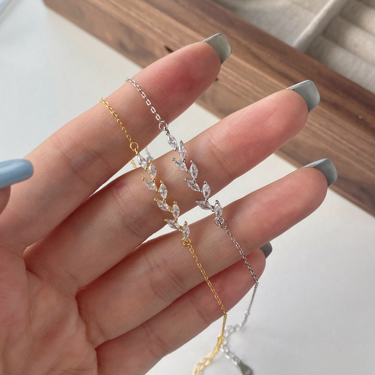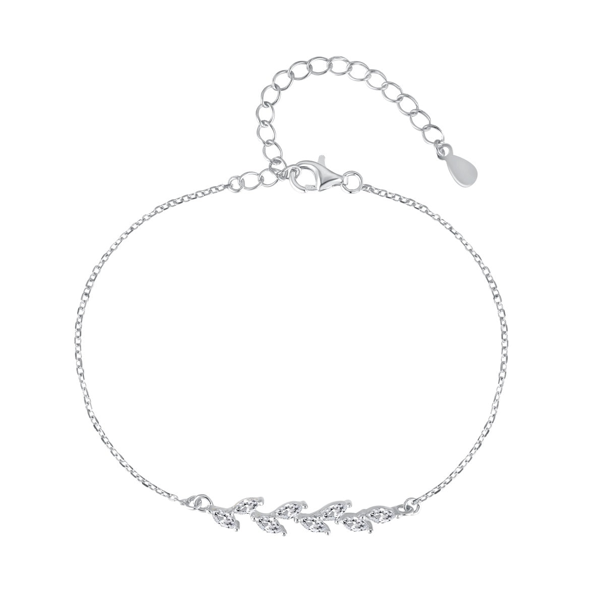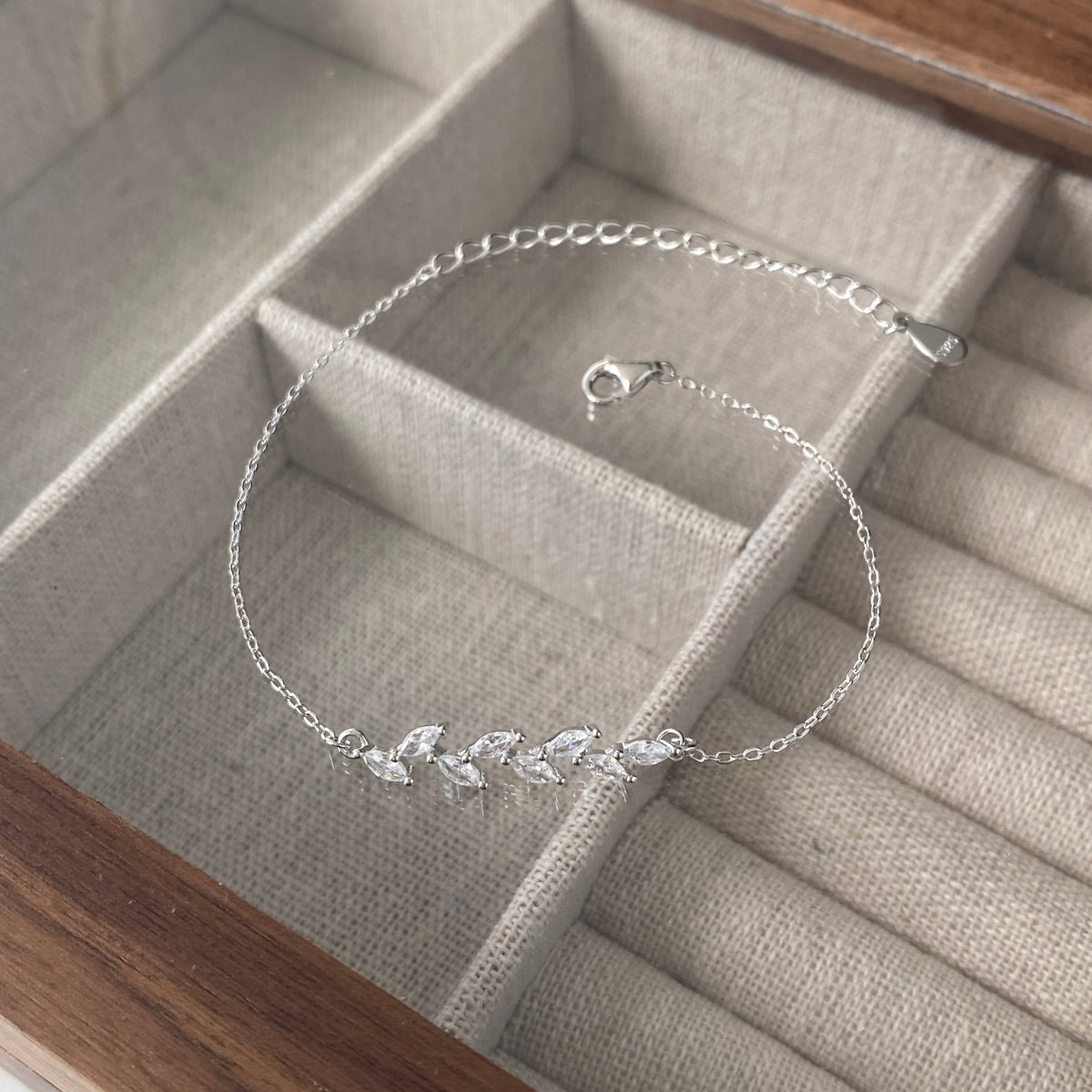 Brățară minimalistă cu segment de frunzulițe din arging 925, pe lanț fin. Hipoalergenică, reglabilă, perfectă pentru layering sau cadou.